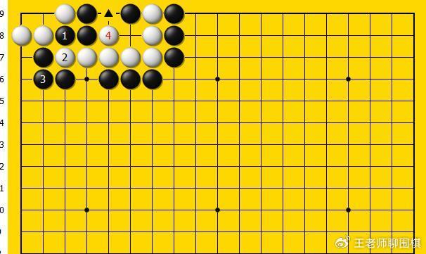 面对白棋2的切断,黑棋3如果在二线粘,来补足棋形的缺陷呢?白棋4会继续在二线来打吃整块黑棋,带三角的点,黑棋不入气,否则就会形成接不归!所以,黑棋就无法在带三角的点,来打吃整块白棋!