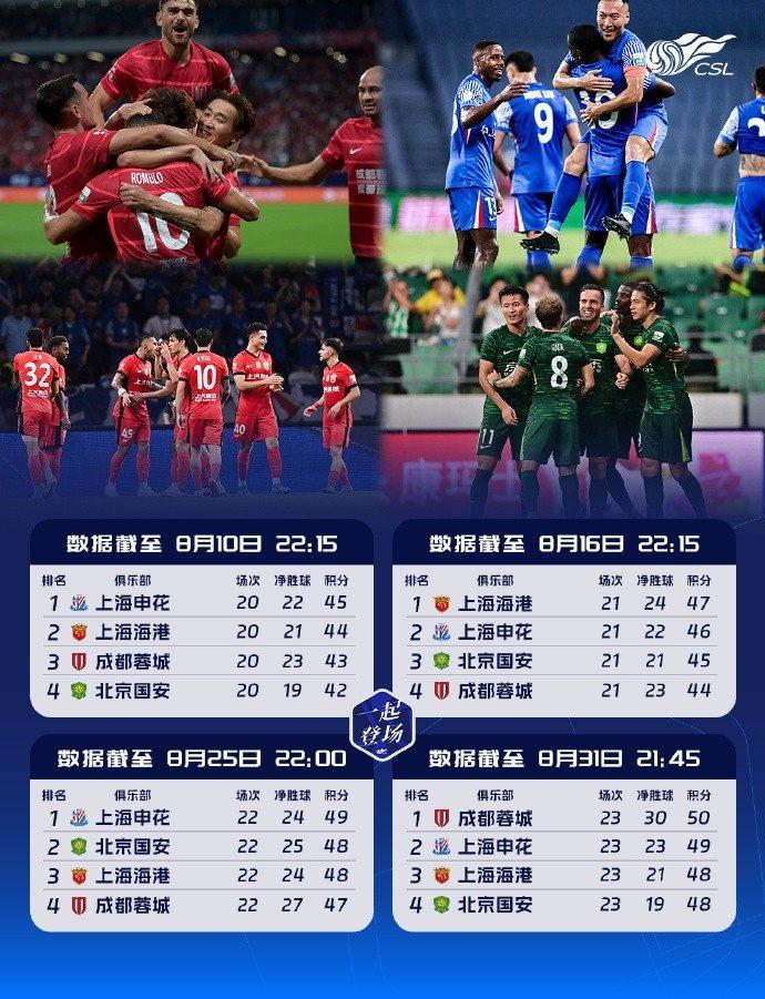直播吧9月12日讯 中超第24轮战火将在本周末重新燃起,目前联赛积分榜上前四名的争夺相当激烈,截至8月31日21点45分的积分榜,成都蓉城以50分暂居榜首,上海申花以49分排在第二,上海海港和北京国安同积48分,分列三、四名。